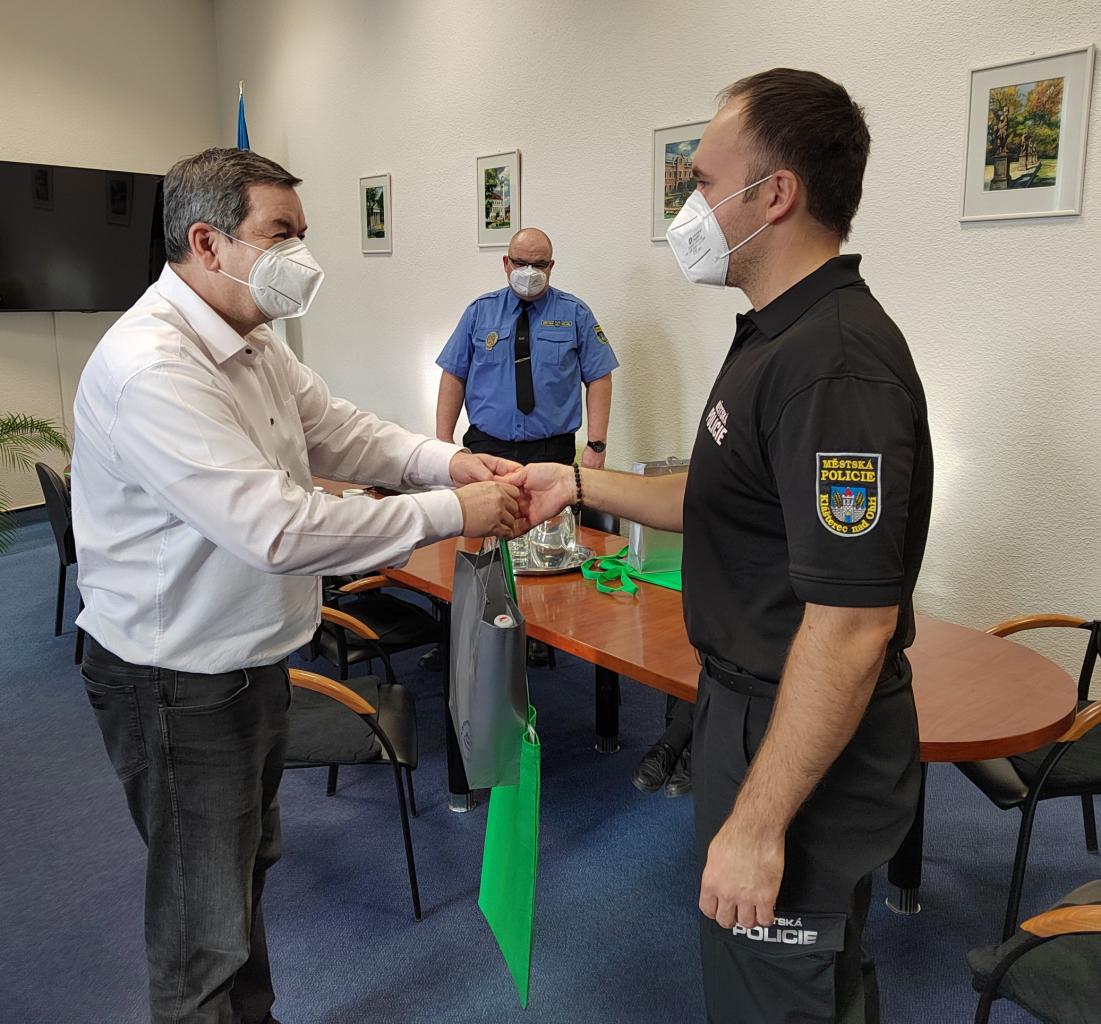 Hlídka městských strážníků ve složení Bohumil Klof a Lukáš Novotný ihned dorazila na místo a zahájila resuscitaci. Za nepřetržité masáže srdce je přístroj navigoval a navedl je i k provedení výboje. Když k pacientovi dorazila rychlá záchranná služba, pacient žil a byl odvezen na specializované pracoviště v Karlových Varech. Záchranáři pohotový a profesionální postup strážníků kvitovali, patří jim za to velký dík. Své poděkování a úctu k jejich profesionálně zvládnutému zásahu jim vyjádřil i starosta města Štefan Drozd a za město jim předal symbolické dárky.