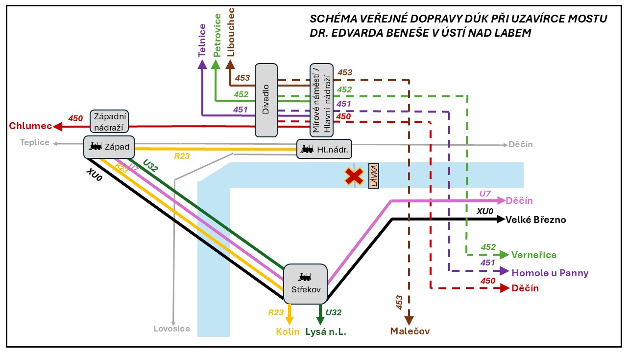 Pro maximálně plynulý provoz ve městě, prosím, využívejte co nejvíce veřejnou dopravu včetně doplněných vlaků mezi Střekovem a nádražím ÚL západ, příp. pěší přesuny (nově zřízená lávka vedle mostu Dr. E. Beneše určená pro pěší a cyklisty vedoucí kolo, lávka na železničním mostě).
