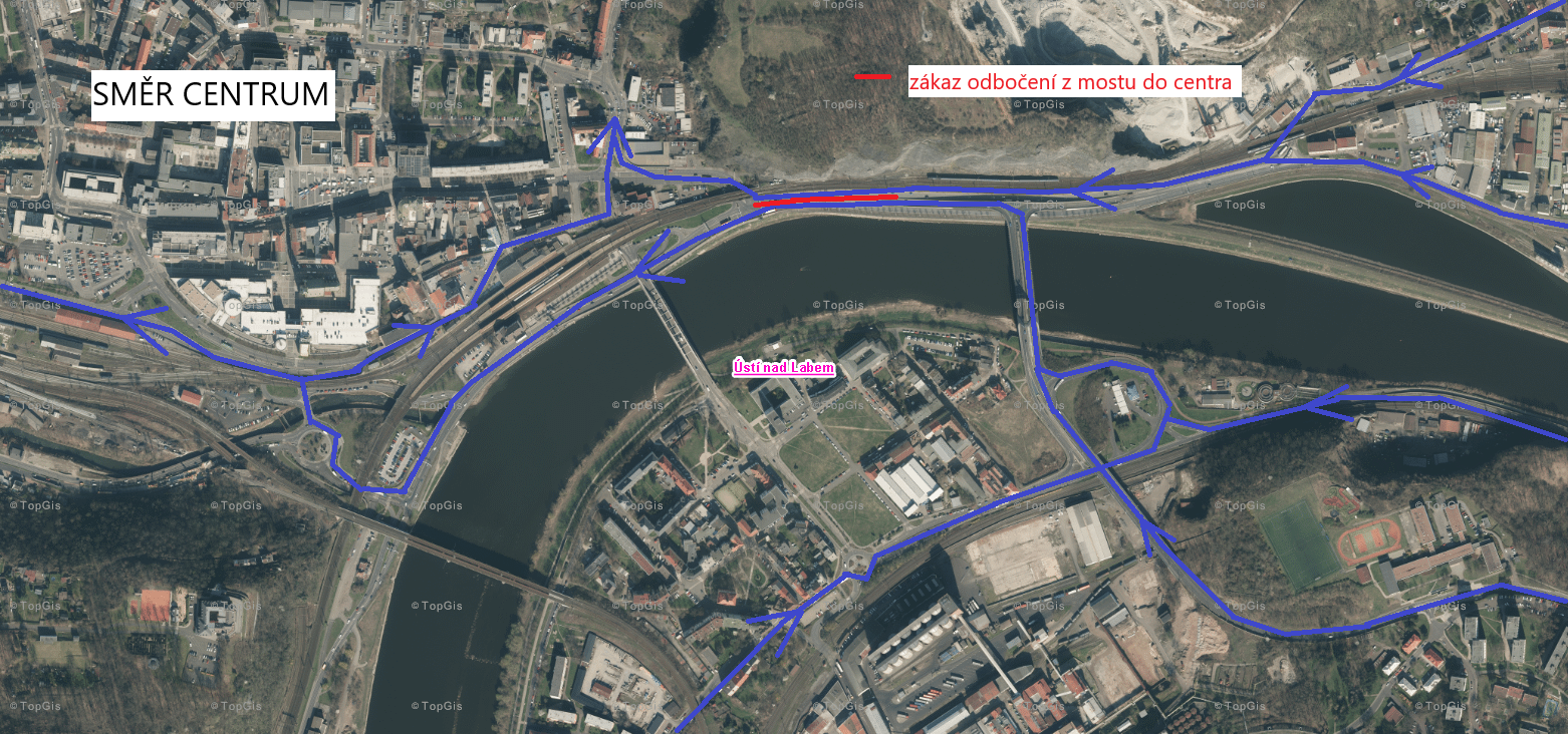 Objízdná trasa směr centrum Ústí nad Labem – z Mariánského mostu nebude umožněno odbočení do ul. Předmostí (mimo BUS DPMÚL a DÚK).