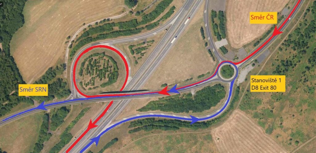 Objízdné trasy (viz fotky) budou vedeny stejně jako v předchozích etapách. Z důvodu zachování bezpečnosti a plynulosti silničního provozu budou celkem na čtyřech vyznačených stanovištích působit hlídky dopravních policistů, které budou dále doplněny ještě o pohyblivou dopravní hlídku. Cílem těchto hlídek bude především zajištění obnovy provozu v případě dopravních komplikací, dohled na dodržování přechodného dopravního značení a pravidel silničního provozu, včetně dohledu na bezpečné a efektivní užívání stanovených objezdových tras. Na základě získaných zkušeností z předešlých uzavírek budou nyní na křižovatce v Petrovicích instalovány informační tabule, které mají za cíl zrychlit odbavení osobních a nákladních vozidel přijíždějících ze SRN. Zároveň byl na dvou kritických místech směrem při stoupání na Petrovice zdrsněn povrch vozovky, aby se co nejvíce předešlo prokluzováním kol nákladních vozidel a tím způsobené vznikající kolony.
