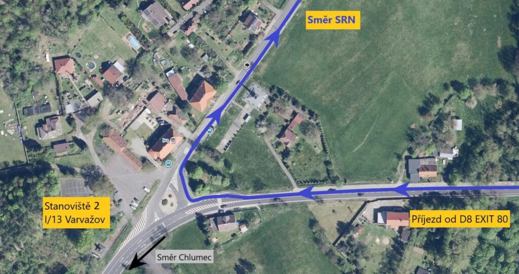 Sjezd z dálnice D8 na 80. km – po silnici č. I/13 směrem na Varvažov – odbočení na silnici č. 248 směrem na Petrovice – nájezd na dálnici D8 na 87. km