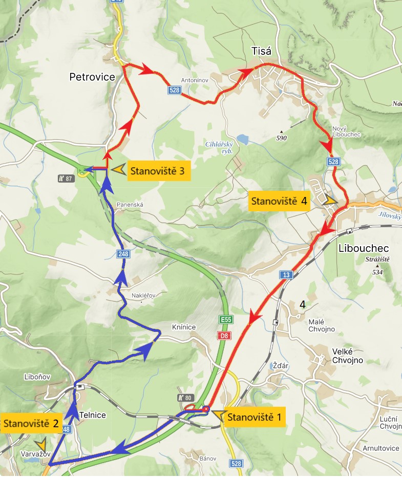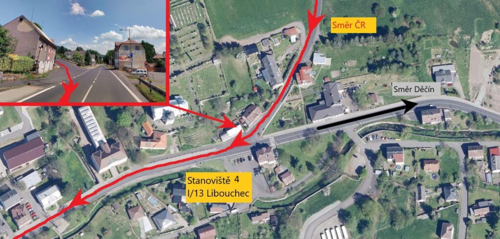 Sjezd na 87. km dálnice D8 – po silnici č. 248 směrem na Petrovice – odbočení na silnici č. 528 směrem na Libouchec – napojení na silnici č. I/13 – nájezd na dálnici D8 na 80. km
