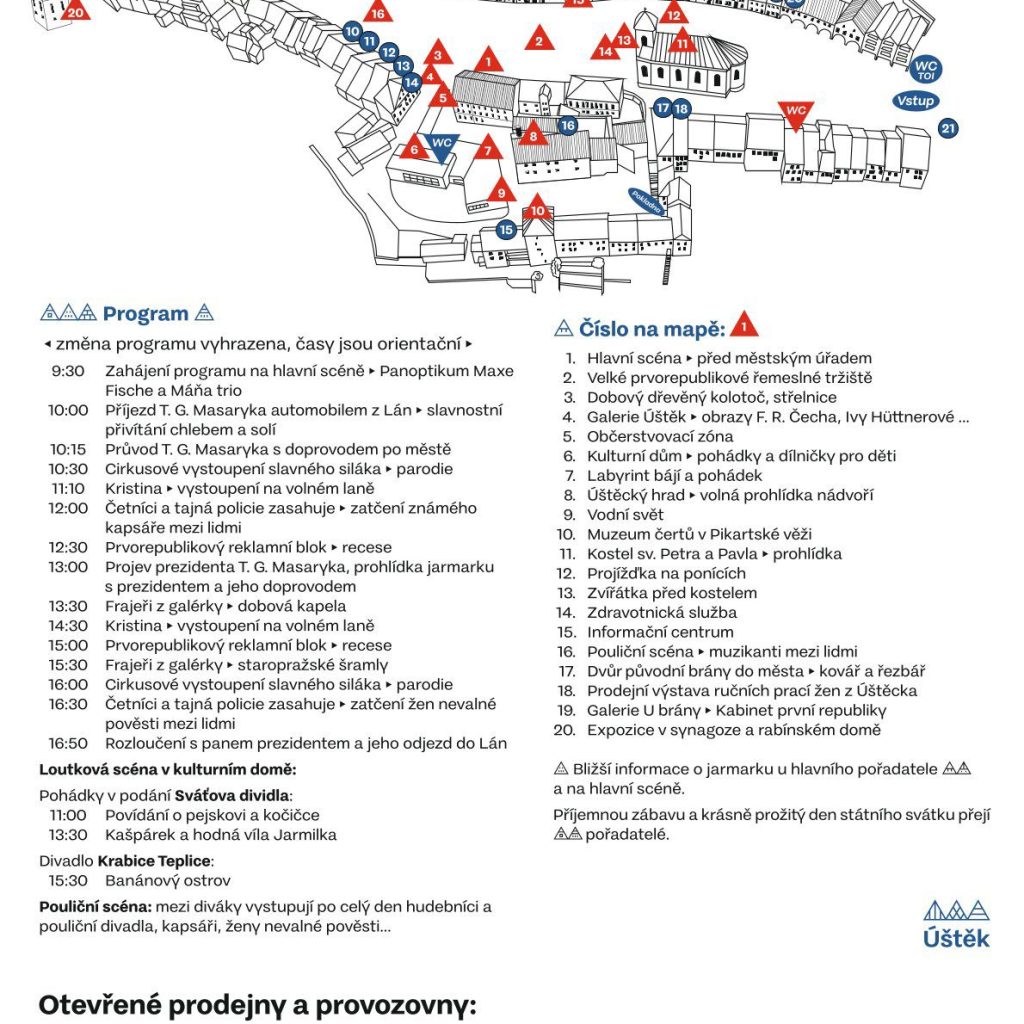 Program na hlavní scéně začne v 9.30 hodin, T. G. Masaryk by měl na jarmark dorazit úderem 10. hodiny. Po uvítání se zhruba v 10.15 vydá s doprovodem po městě. Krátký projev bude mít první československý prezident ve 14 hodin. Se svými příznivci se rozloučí před 17. hodinou.