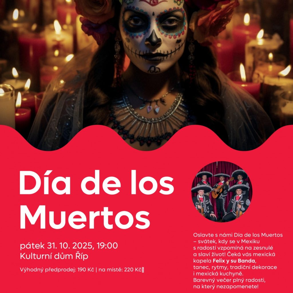 Roudnice nad Labem – Znáte mexický svátek Día de los Muertos?  Je to tamní nejoblíbenější a nejvýznamnější svátek, který Mexičané chápou jako šťastné shledání mrtvých a živých. Zatímco u nás slavíme Dušičky, které máme spojené se svíčkami, hřbitovy a tichem, Mexičané oslavují a vzpomínají na své blízké, kteří již nejsou mezi živými. Jedna taková veselá, pestrobarevná oslava se bude konat tento pátek 31. října od 19 hodin v Kulturním domě Říp v Roudnici nad Labem.