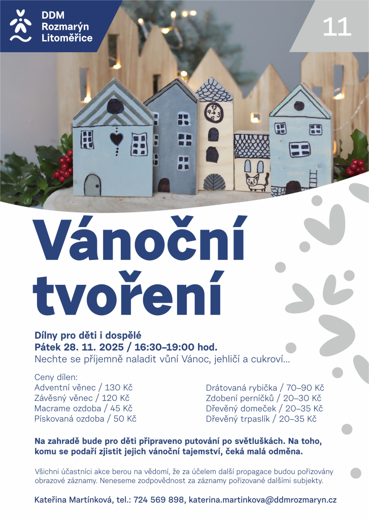 LITOMĚŘICELitoměřický Dům dětí a mládeže Rozmarýn zve děti i dospělé na tradiční Vánoční tvoření, které se uskuteční v pátek 28. listopadu 2025 od 16:30 do 19:00 hodin. Čeká vás příjemné odpoledne provoněné jehličím, cukrovím a vánoční atmosférou, během kterého si budete moci vyrobit vlastní dekorace a originální dárky.