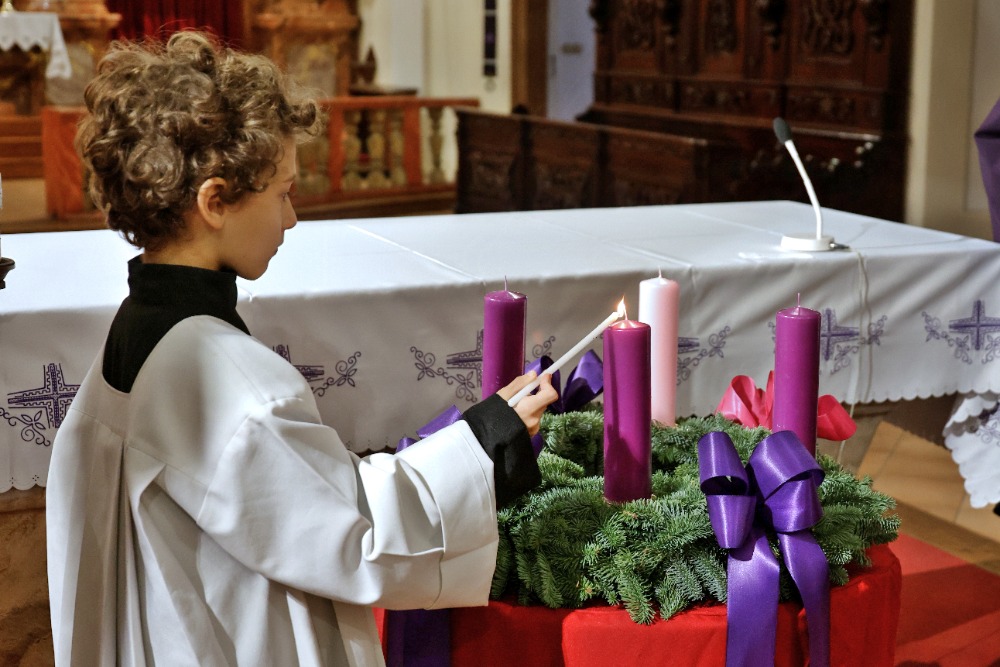 LITOMĚŘICE – Malý Filip Žonca rozsvítil první svíčku na adventním věnci v děkanském kostele Všech svatých v Litoměřicích. V liturgickém rouchu fialové barvy sloužil nedělní první adventní mši probošt Mons. Józef Szeliga, který v úvodu požehnal farníkům adventní svícny.