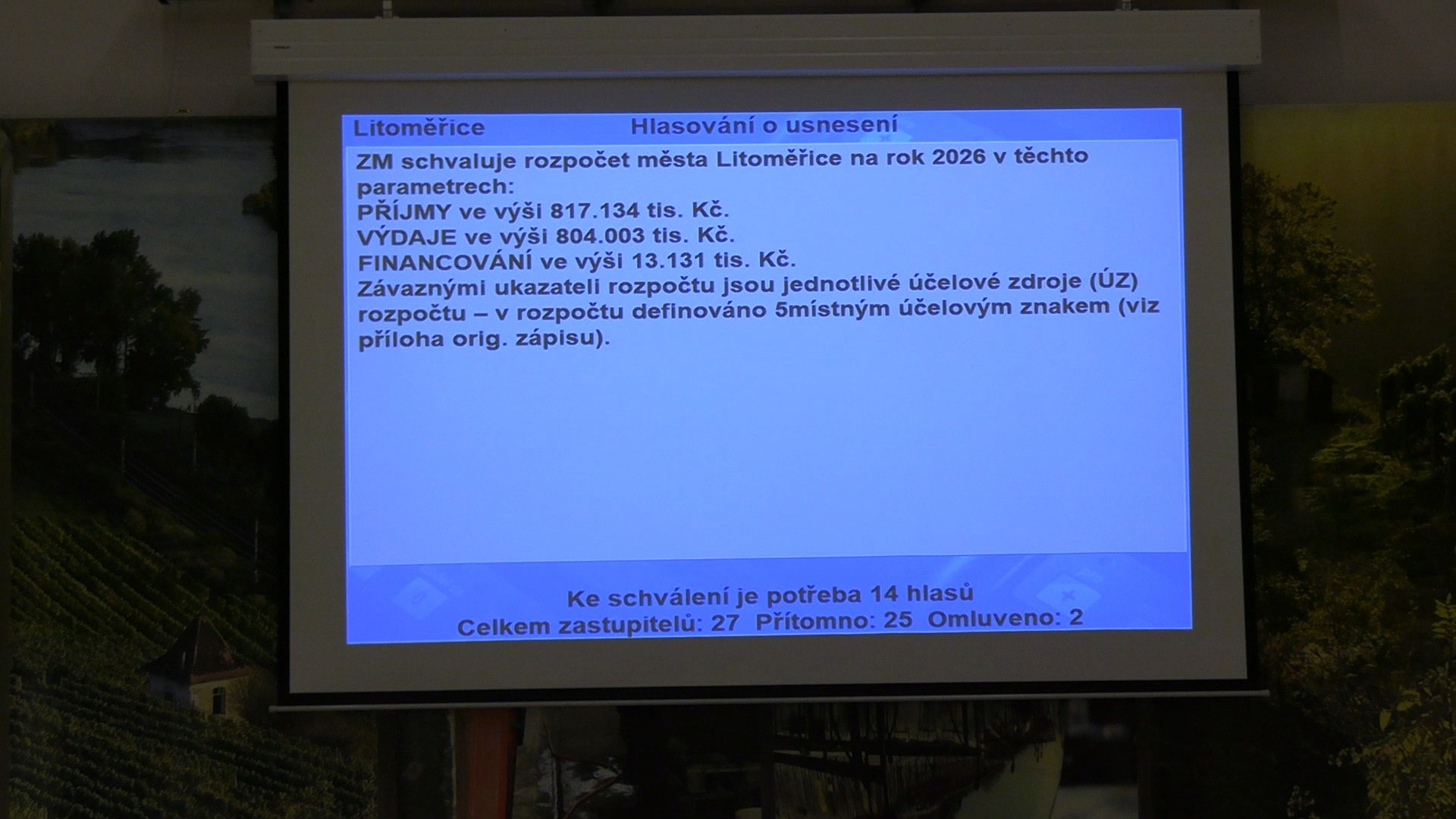 LITOMĚŘICE – Litoměřičtí zastupitelé na svém čtvrtečním jednání schválili rozpočet města pro příští rok. Pro jeho navrženou podobu hlasovalo shodně všech 25 přítomných zastupitelů. Dva zastupitelé byli z dnešního jednání omluveni. Rozpočet počítá s příjmy ve výši 817,1 milionu korun a výdaji 804 milionů korun, což představuje přebytek 13,1 milionu korun. Ten bude následně využit v rámci financování.