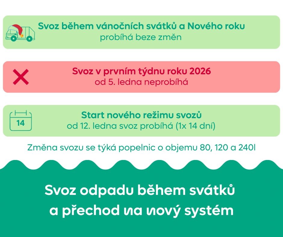 • První lednový týden (5.–11. 1.): Svoz neproběhne (poslední „starý“ svoz bude na Nový rok).