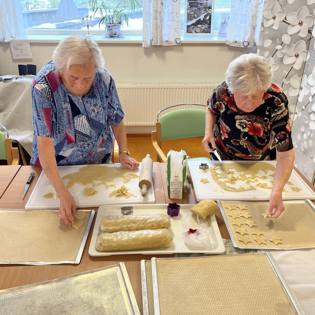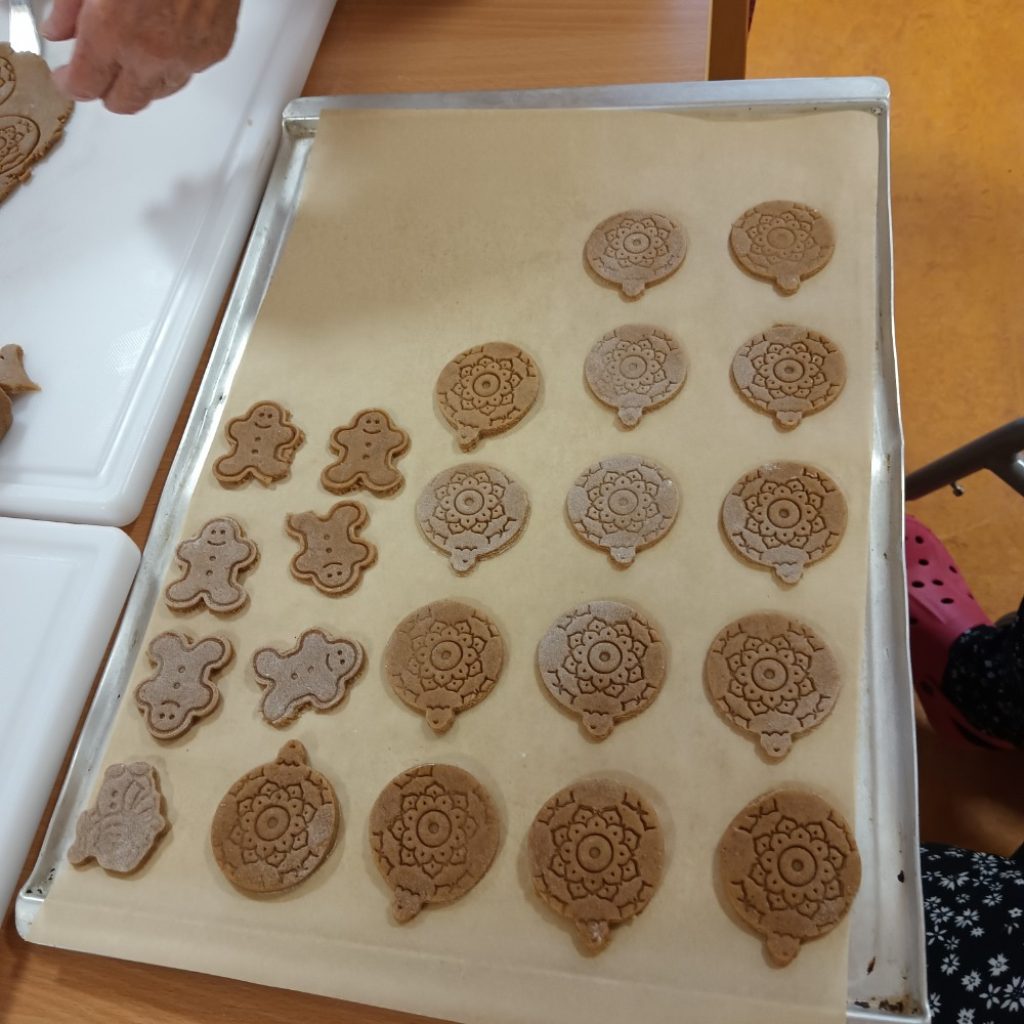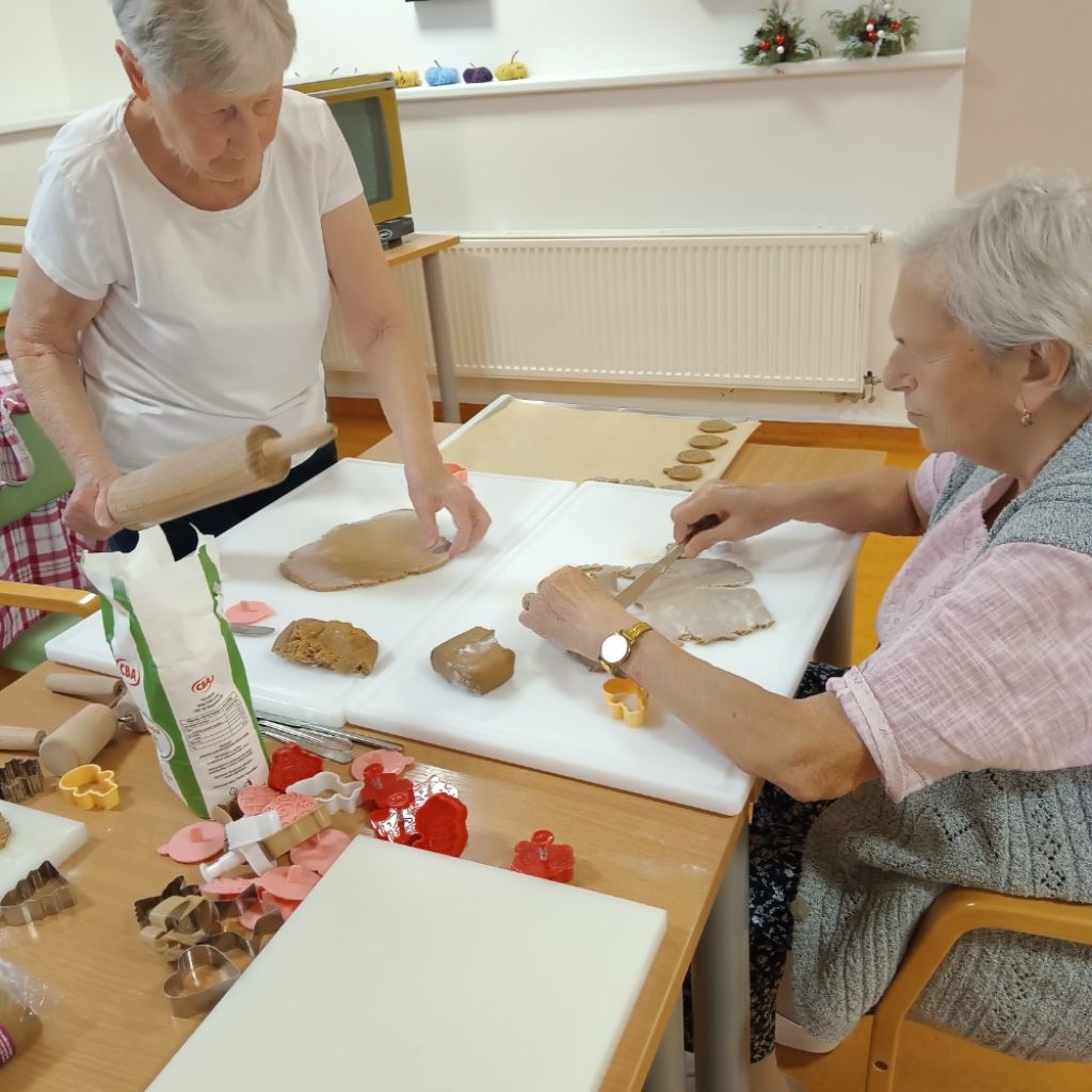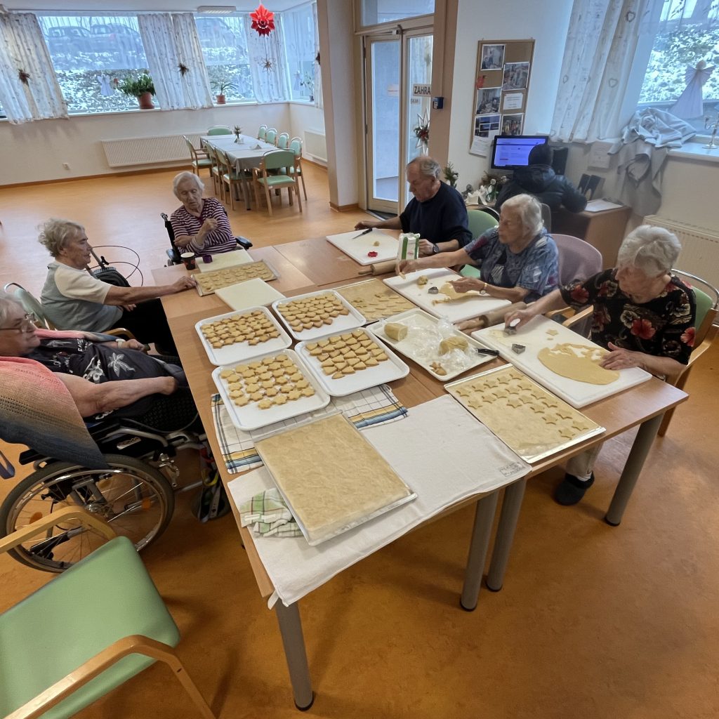 Společně s klienty se aktivizační pracovnice pustily do pečení tradičních vánočních dobrot – lineckého cukroví, vanilkových rohlíčků, perníčků i oblíbených nepečených kokosových kuliček.