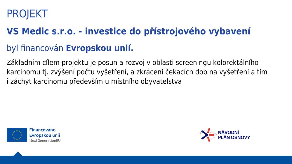 Gastroenterologická ordinace VS Medic s.r.o., MUDr. Veronika Slejšková oznamuje, že v 12_2025 dokončila fyzickou realizaci projektu VS Medic s.r.o. – investice do přístrojového vybavení podpořeného z prostředků z RRF (resp. nařízení Evropského parlamentu a Rady (EU) 2021/241 ze dne 12. února 2021, kterým se zřizuje Nástroj pro oživení a odolnost) za účelem zvýšení kapacity a efektivity v oblasti screeningu kolorektálního karcinomu.