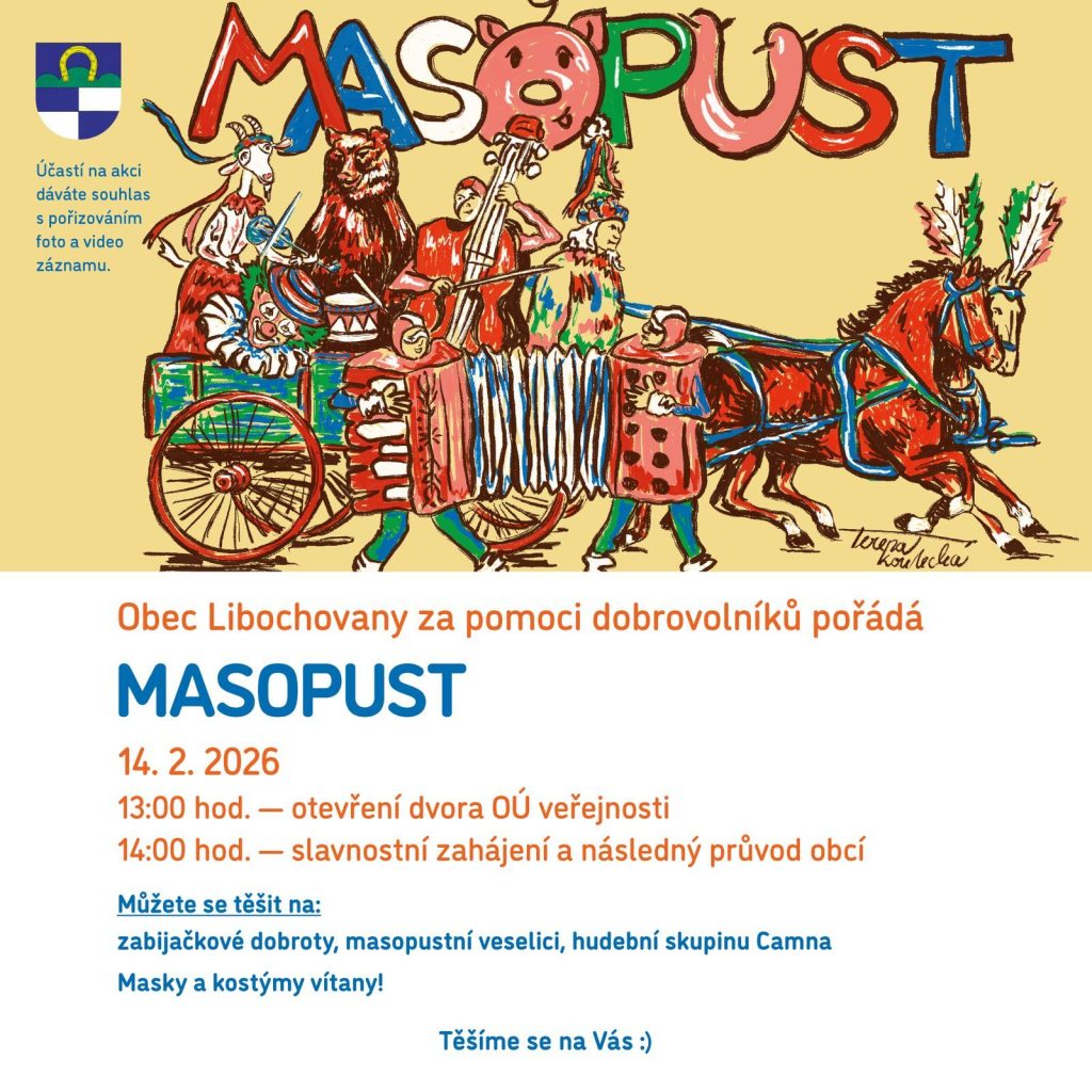Libochovany – Také obcí Libochovany projde v sobotu 14. února za doprovodu živé muziky průvod masek. Přidejte se! Průvod vychází ve 14 hodin od obecního úřadu. Projde obcí a vrátí se zpět. Ve dvoře obecního úřadu pak bude připravené masopustní občerstvení – koláče, koblihy, jitrničky a jelítka.