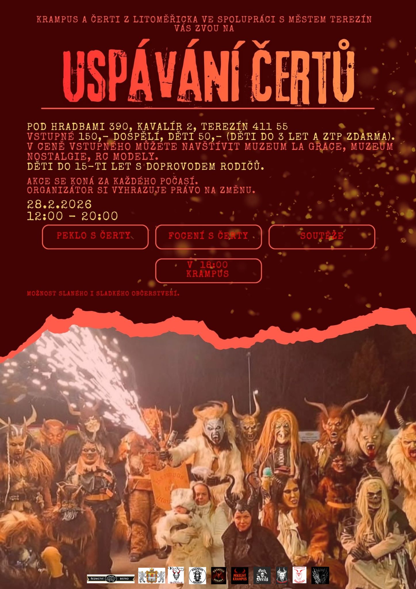 TEREZÍN – Máte pro strach uděláno, nebo si jen chcete užít netradiční rodinné odpoledne? V sobotu 28. února se brány terezínského Kavalíru 2 otevřou všem pekelným bytostem. Skupina Krampus a čerti z Litoměřicka ve spolupráci s městem Terezín připravila oblíbenou akci „Uspávání čertů“, která slibuje zábavu pro malé i velké odvážlivce.