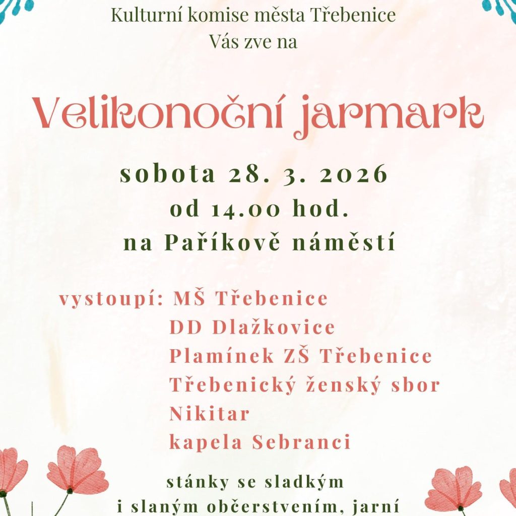 Třebenice – Už tuto sobotu 28. března se v Třebenicích koná VELIKONOČNÍ JARMARK. Tradiční akce se spoustou stánků a vyhlášenou atmosférou se bude odehrávat na Paříkově náměstí od 14 hodin. Přijďte!