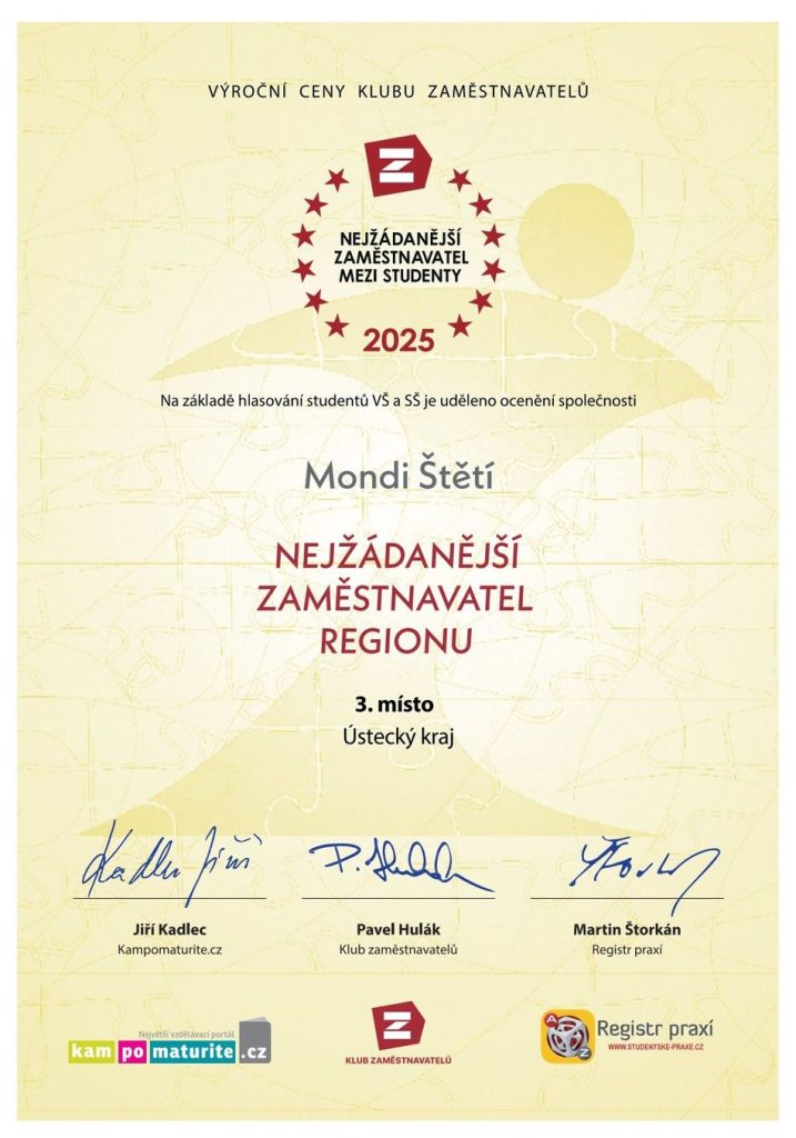 10. dubna 2026, Štětí, Česká republika – Společnost Mondi Štětí získala 3. místo v anketě „Nejžádanější zaměstnavatel mezi studenty“ roku 2025 v Ústeckém kraji. Ocenění potvrzuje, že studenti vnímají Mondi Štětí jako atraktivního zaměstnavatele, který nabízí smysluplnou práci, moderní výrobní prostředí i široké možnosti profesního rozvoje. Podle zveřejněných výsledků ankety skončila v kraji za společnostmi ORLEN Unipetrol a AGC.