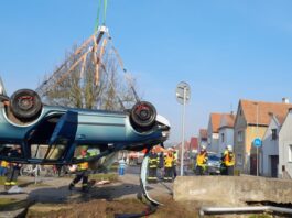 FOTOGALERIE: Dramatické ráno v Brozanech: Osobní auto skončilo v náhonu na střeše, vyprostit ho musel speciál